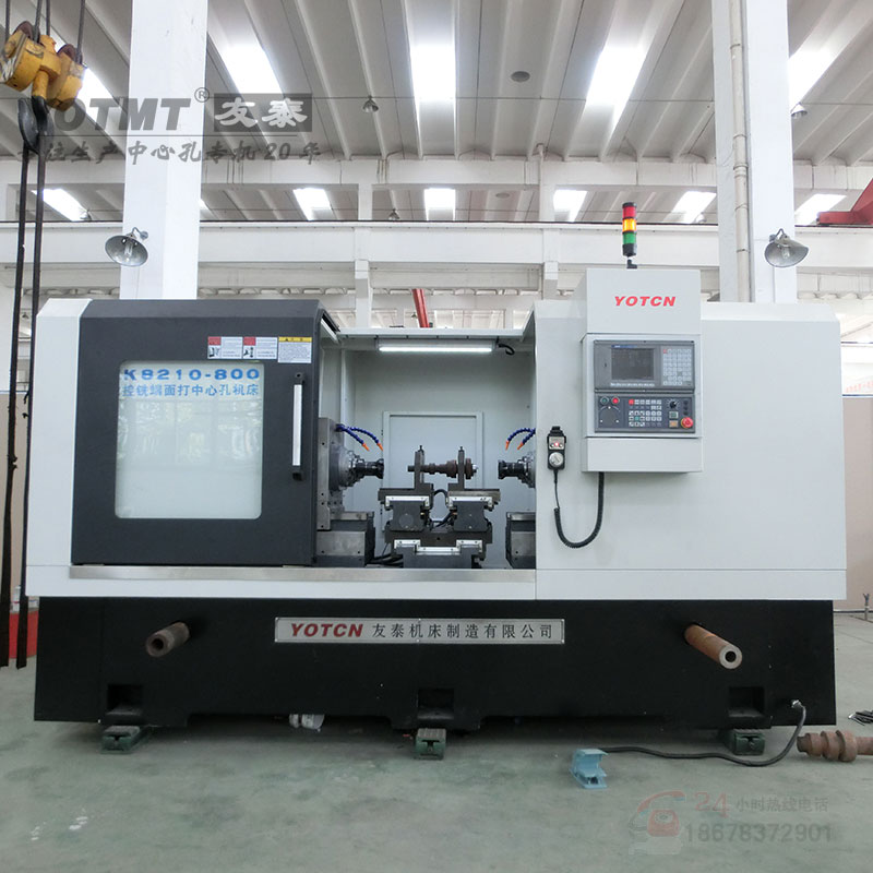 九游(中国)机床设计生产的ZK8210-800铣端面打中心孔机床实现一次装夹,同时完成工件两端加工,确保轴件箱体类零件两端精度高度一致性,节省工时,提高效率300%以上。